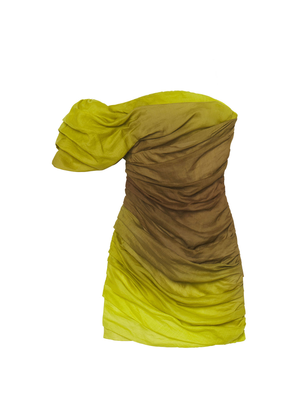 The Kyler Dress is crafted from airy ramie voile in a striking ombré that fades from electric citron to deep earthen brown. This off-the-shoulder mini features a built-in bra, a ruched silhouette with asymmetrical draping and a voluminous puff sleeve that balances the fitted, curve-tracing shape. This non-stretch style runs small, we recommend taking one to two sizes up from your usual size. Shop Dresses.
