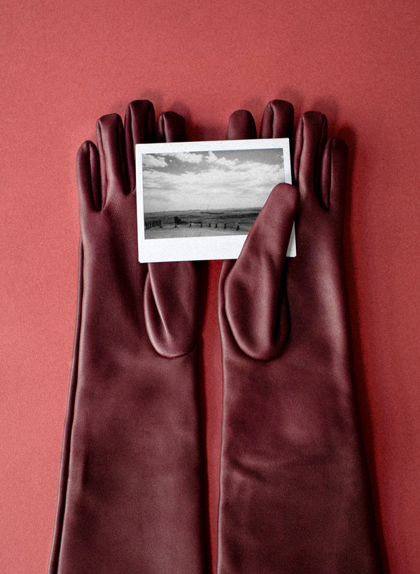 Pair of long burgundy gloves on a light gray background