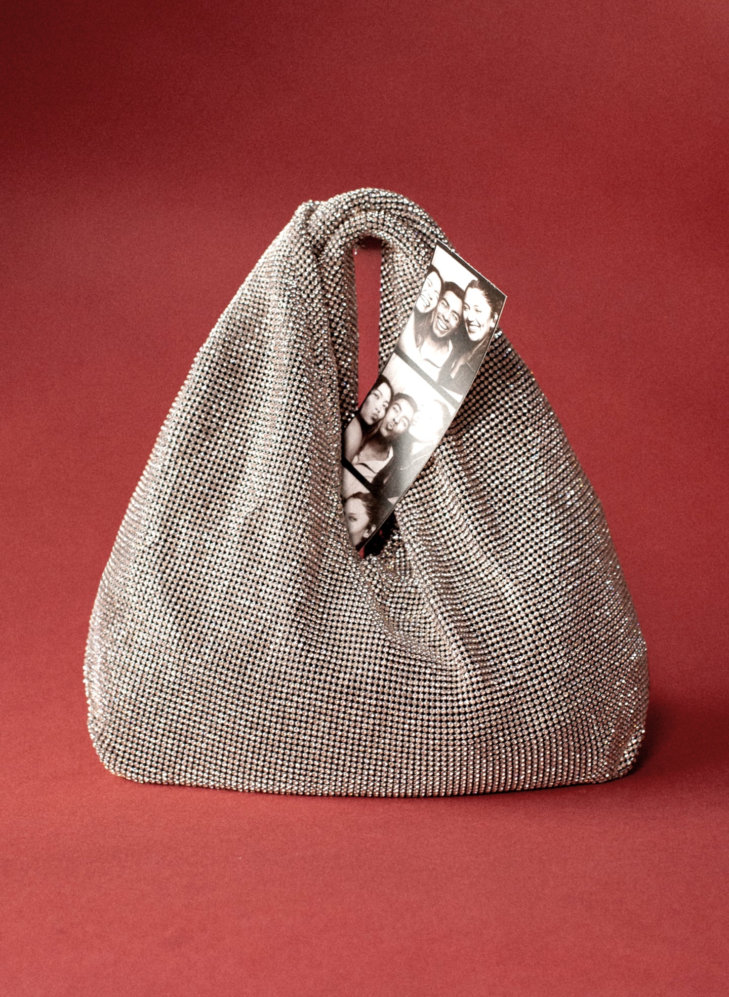 Person wearing a black suit holding a silver clutch against a light gray background
