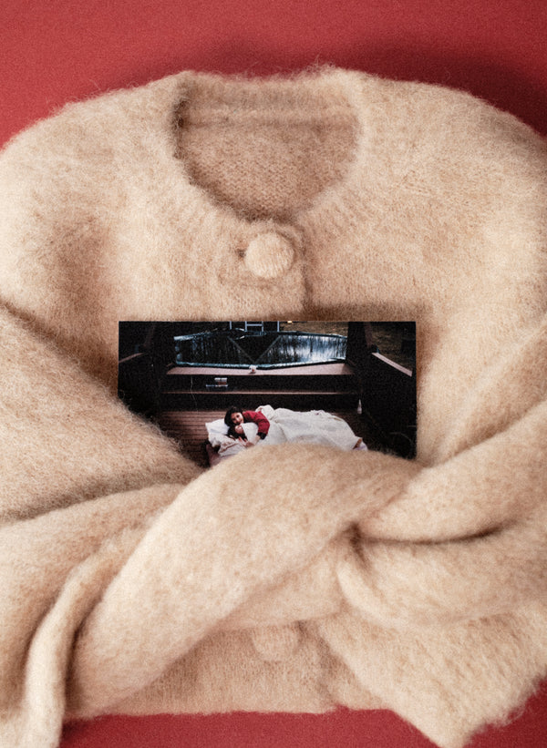 Close-up of a beige cardigan with button details on a neutral background