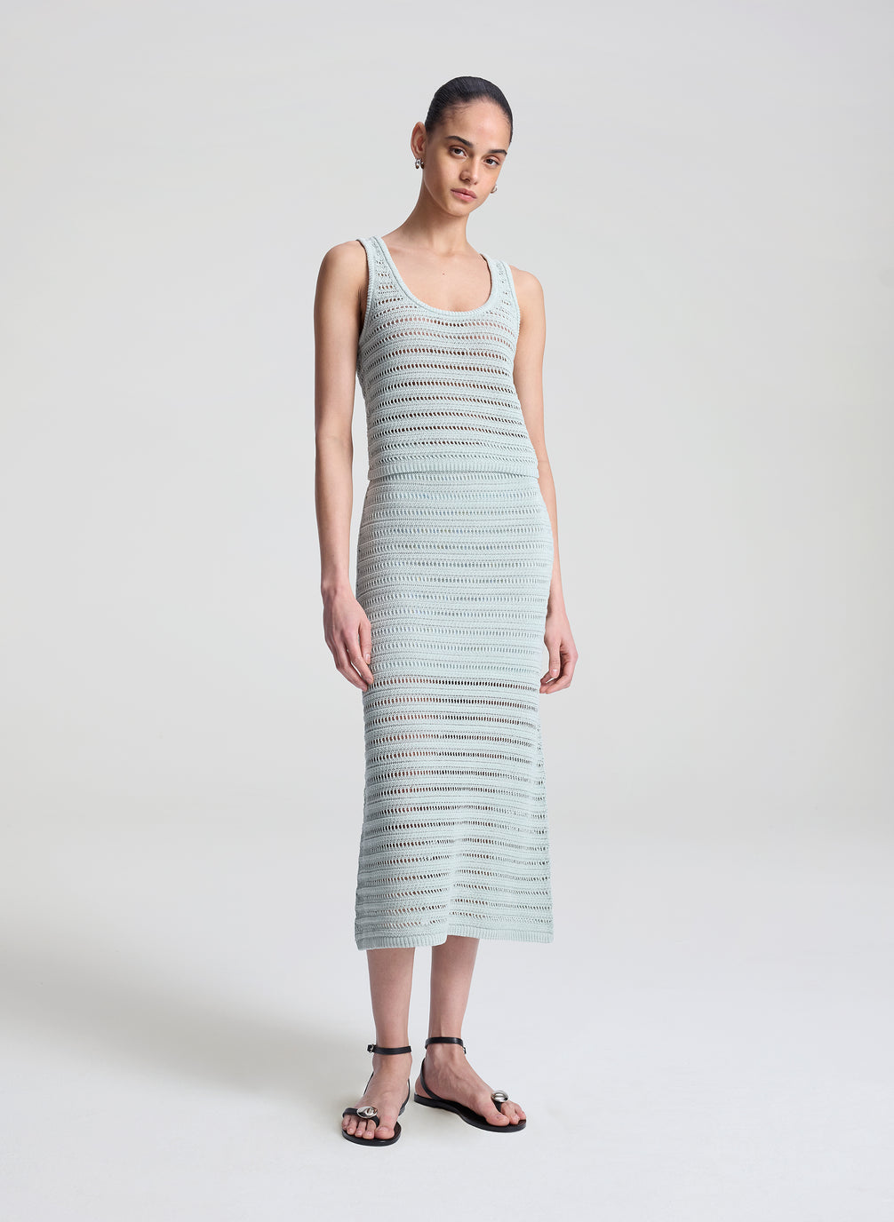 The Kira Top is crafted from our soft cotton crochet in a delicate cascade blue hue. This unlined, scoop-neck silhouette features intricate open-weave detailing that lends a breezy feel. Shop Tops.