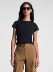 detail view of woman wearing black strapless crop top and black pants