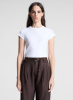detail view of woman wearing off white cropped strapless top with white maxi skirt