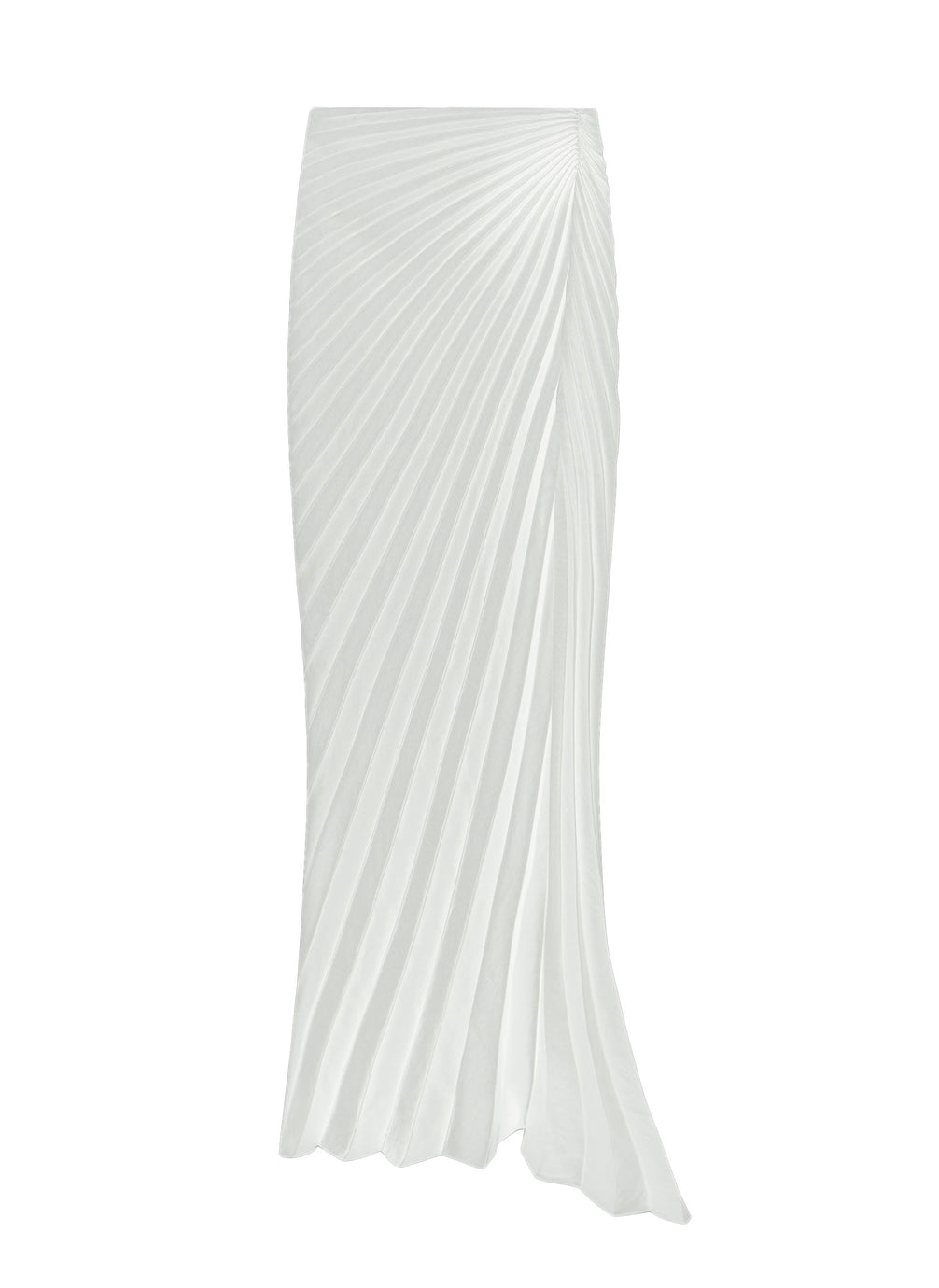 The Bianca Skirt is crafted from our signature vintage satin in a bright white hue. This maxi silhouette features starburst pleating and ruched detailing at the hip, flowing into an asymmetrical hem that creates an elongating, modern shape. Shop Skirts.