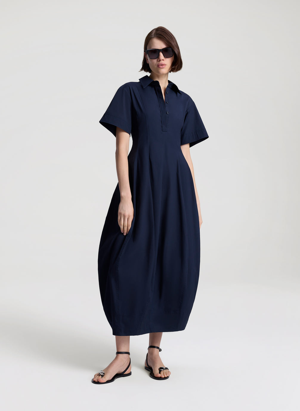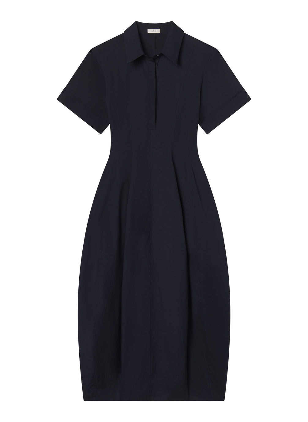 The Della Dress is crafted from crisp pima stretch poplin in a deep evening blue. This short-sleeve shirtdress silhouette features a sharp collar, buttoned placket, and sculptural volume through the midi-length skirt—tempered by vertical seams and discreet side pockets. The seamed waist accentuates the waist, creating a clean, sculpted fit. Shop Dresses.