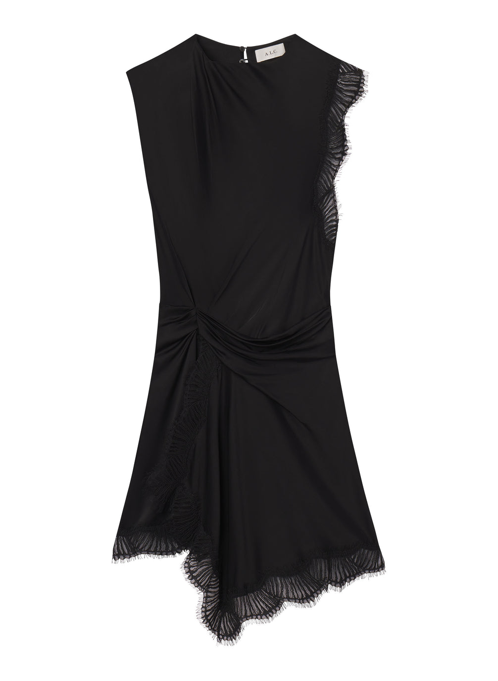 The Dion Dress is crafted from fluid black viscose and trimmed with tonal eyelash lace. This sleeveless mini silhouette features artful draping across the neckline and a gathered waist that flows into an asymmetrical hem. Lace detailing along one arm and the hem adds a subtle dose of texture and contrast, while a back keyhole with hook-and-eye closure completes the look. We recommend sizing down for a more tailored fit. Shop Dresses.