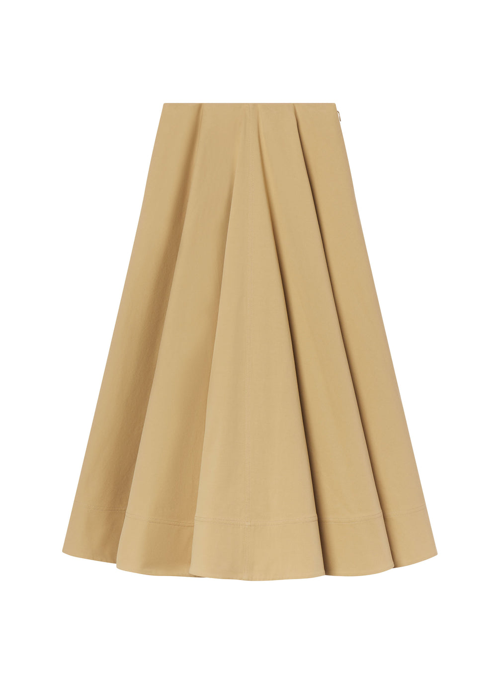 The Eleanor Skirt is crafted from our soft cotton gabardine—a refined Italian fabric produced in Tuscany using select raw materials, with meticulous spinning, weaving, dyeing, and finishing to achieve its smooth, breathable feel—in a desert beige hue. This A-line midi silhouette features a high waist, clean front panel, and flap pockets at the hip, blending structure with soft movement for a directional warm-weather look. Shop Skirts & Shorts.