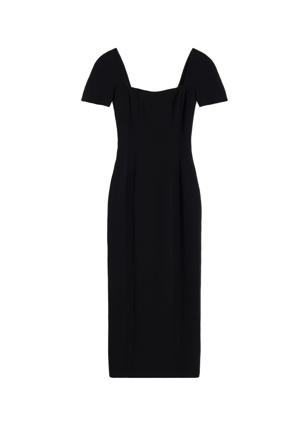 The Elvie Dress is crafted of our structured cady fabric in timeless black. This softly sculpted silhouette features short sleeves, a square neckline, and darted seams for a sleek, feminine fit. Pockets and a back slit complete the look. Shop Dresses