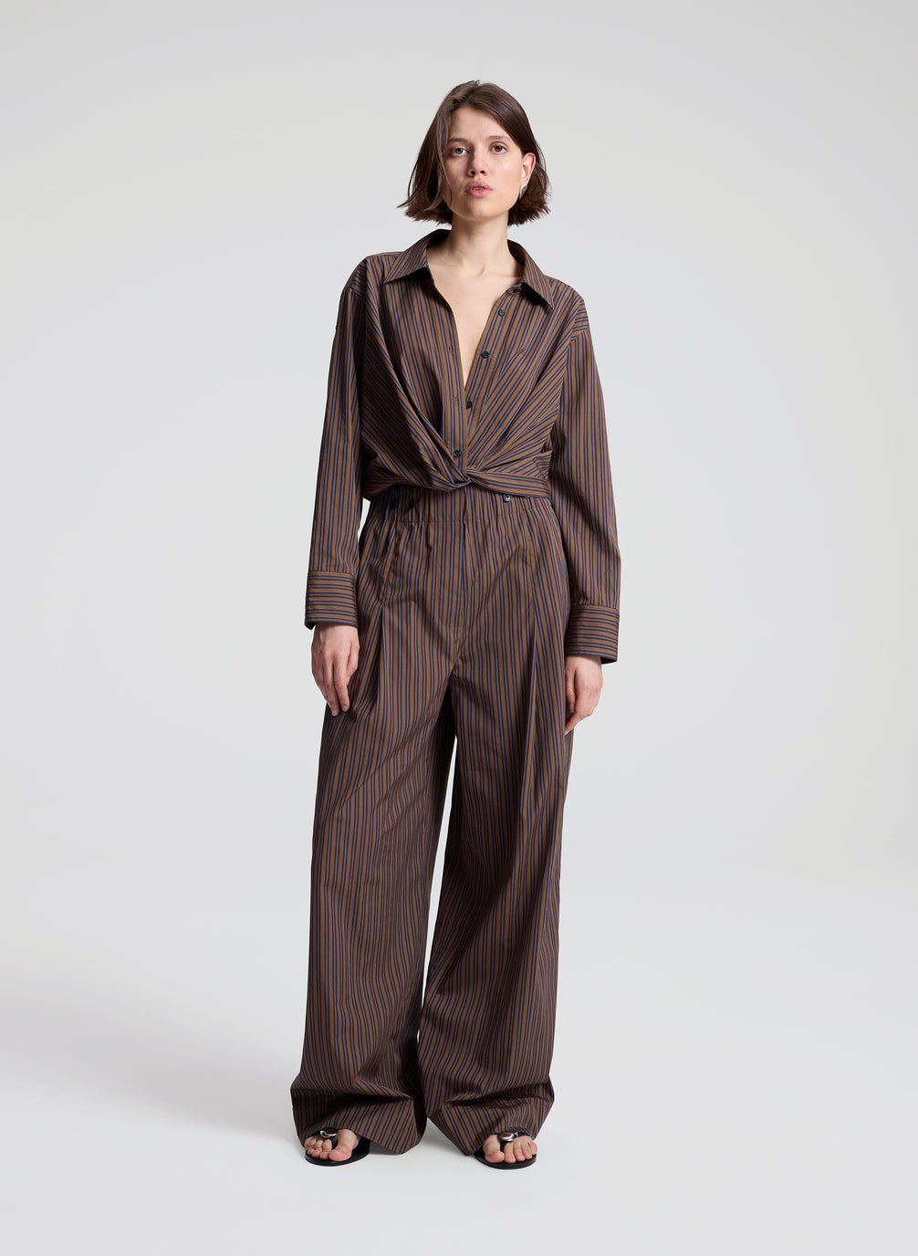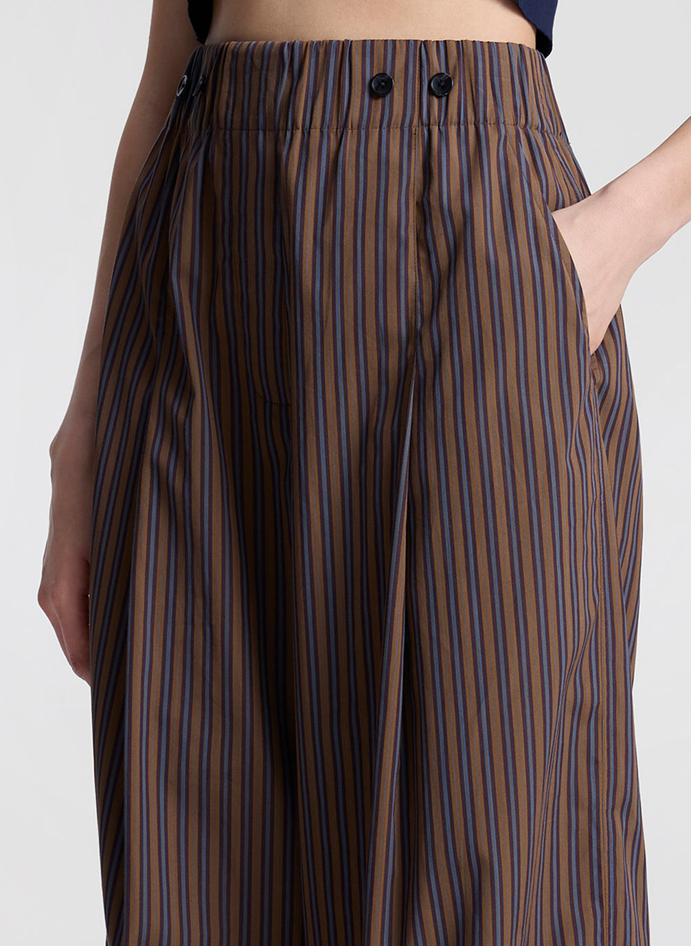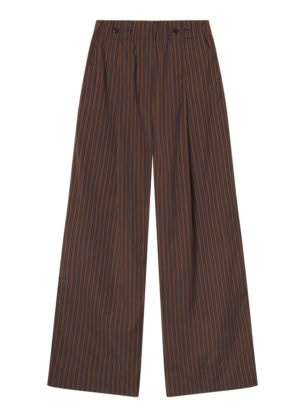 The Emmett Pant is crafted from crisp 100% cotton in a vertical shirting stripe that blends earthy brown, blue, and mauve tones. This wide-leg silhouette features soft front pleats, an elasticized waistband with button detailing, and side pockets—bringing a relaxed finish to the clean, tailored lines. This style runs large. Shop Pants.