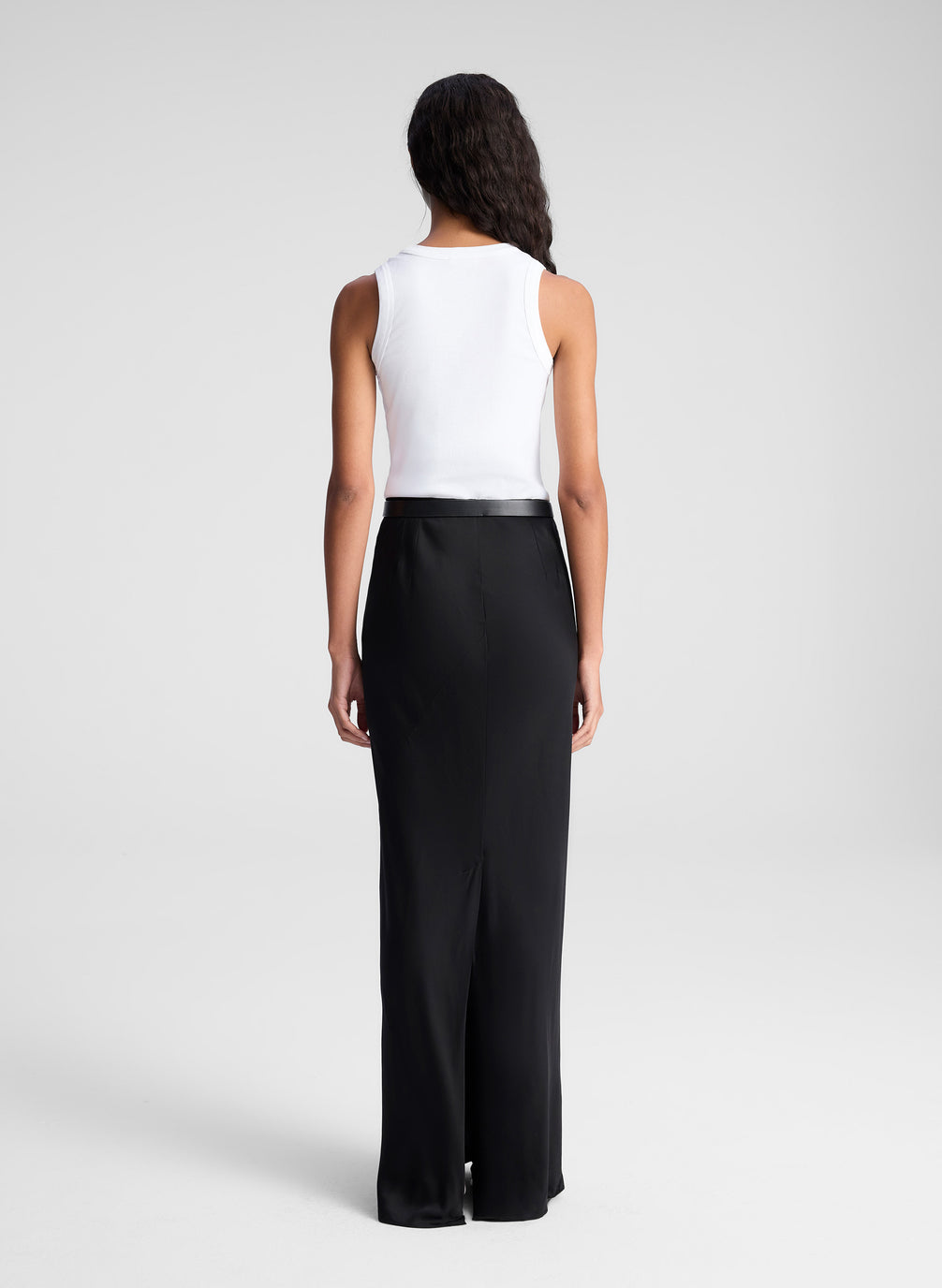 The Greta Skirt is crafted from our fluid viscose fabric in classic black. This long bias cut silhouette sways beautifully with every step. Shop Bottoms.