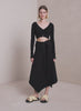 Woman wearing a black long-sleeve top and skirt set against a plain background
