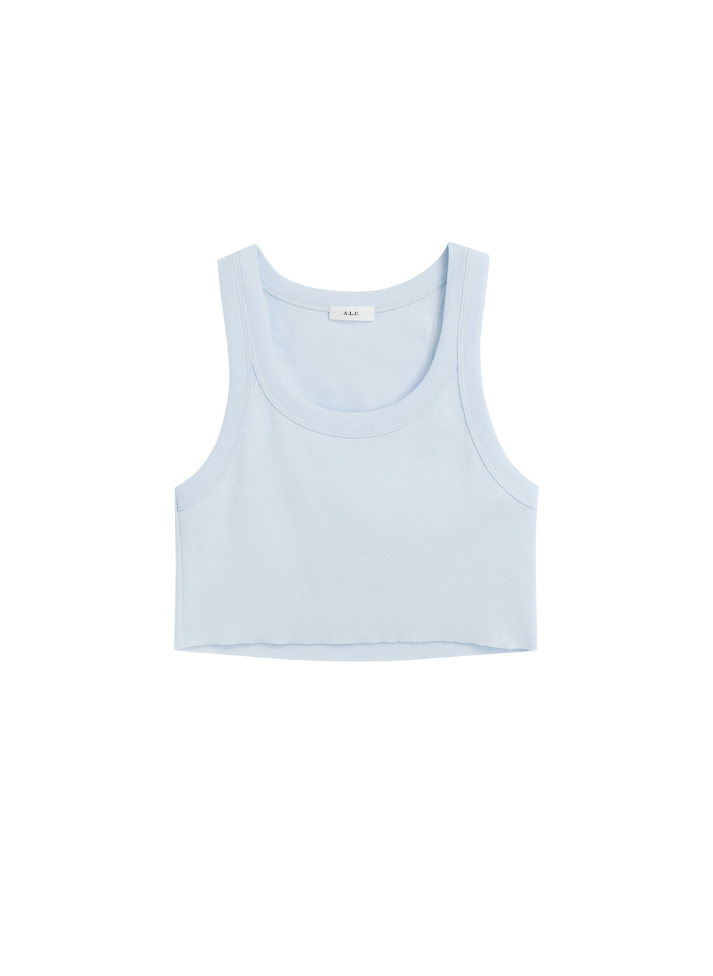 The Halsey Tank is crafted from a soft ribbed cotton fabric in a fresh, ice-blue hue. This cropped silhouette features a scoop neckline, thick straps, and a raw hemline, offering a minimalist yet refined look. Shop Tops.