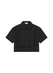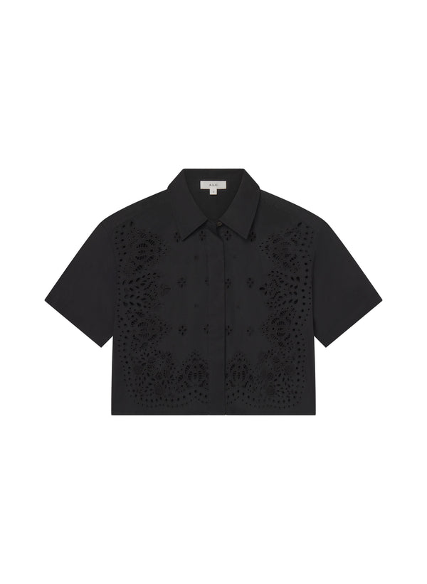 The Jay Skirt is crafted from black cotton poplin embroidered with bandana-inspired motifs. This full midi silhouette features a gathered waist, in-seam side pockets, and intricate eyelet embroidery along the hem for added texture and dimension. Shop Skirts & Shorts.