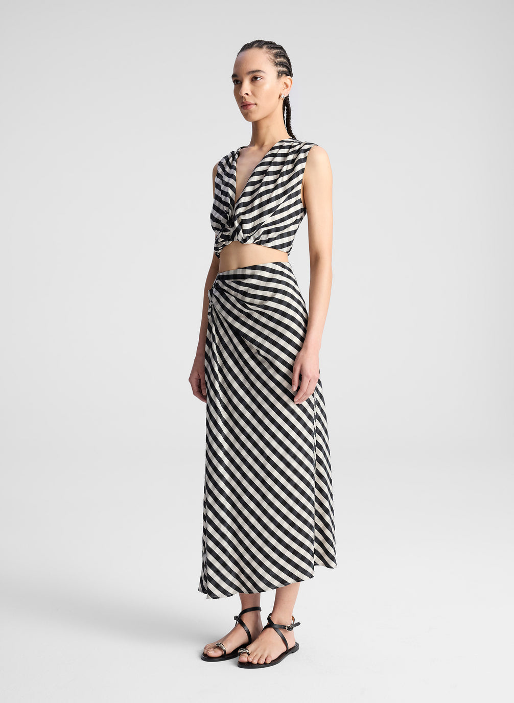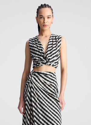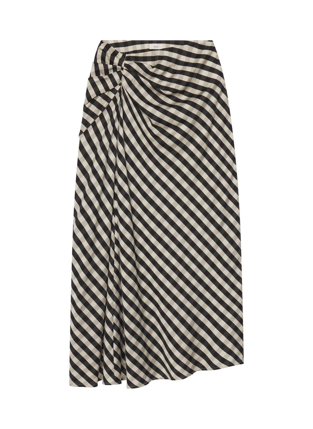 The Jean Skirt is crafted from our fluid gingham—a drapey, soft-viscose blend woven with Tencel and nylon for breathability and movement—in a graphic black and tan check. This high-rise, midi-length silhouette features artful draping with a gathered knot detail at the hip and an asymmetrical hem that enhances the skirt’s natural fluidity. Shop Skirts & Shorts.