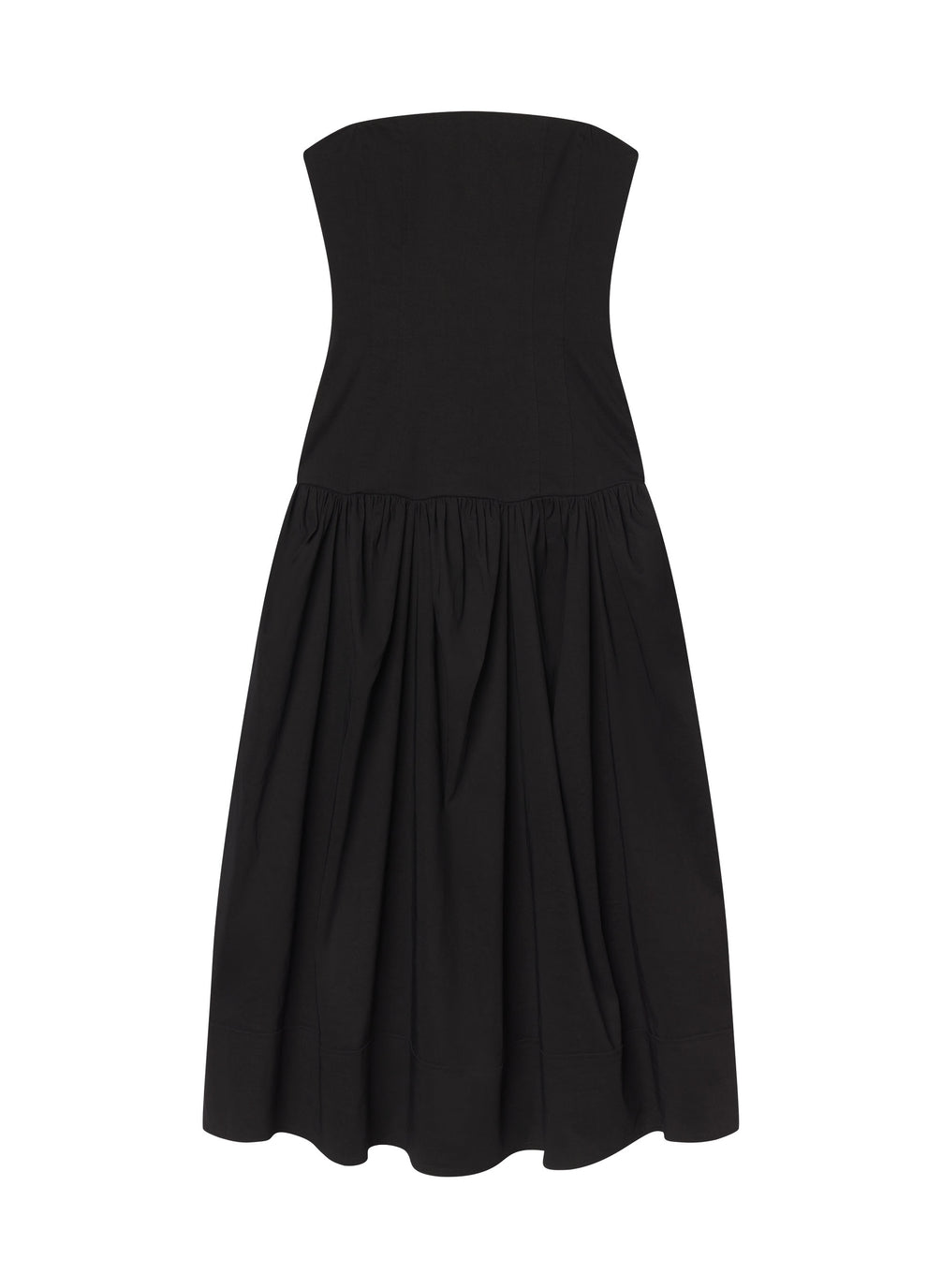 The June Dress is crafted from compact stretch linen—an elevated, softly structured fabric that blends linen, viscose, and a hint of stretch—in classic black. This strapless midi silhouette features a bodice with a built-in corset and a drop waist that releases into a full gathered skirt, offering ease and movement. Shop Dresses.