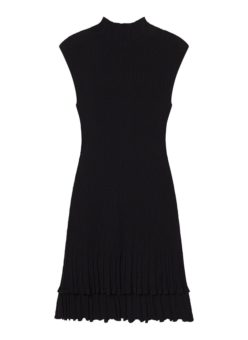 The Ken Dress is knitted from an Italian fine-gauge cotton-blend yarn—exclusive to A.L.C.—in a true black hue. This sleeveless mini silhouette features tiered pleats at the hem, adding texture and movement to its clean, body-skimming shape. Shop Dresses.