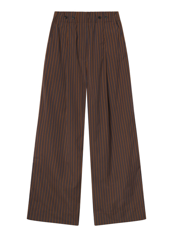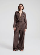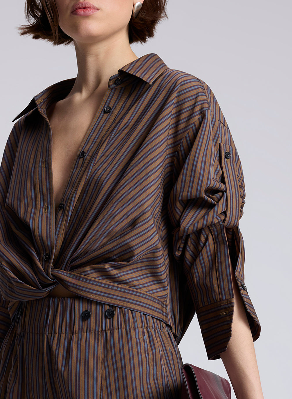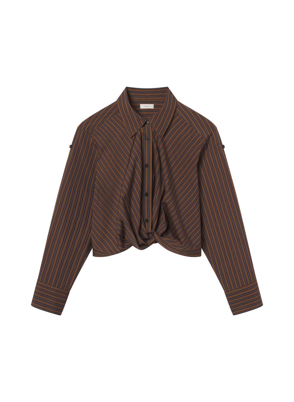 The Leo Top is crafted from crisp 100% cotton in a vertical shirting stripe that blends earthy brown, blue, and mauve tones. This cropped button-down silhouette features a sharp collar, convertible long sleeves, and a twisted hem detail that hits at the navel for a relaxed, modern shape. Shop Tops.