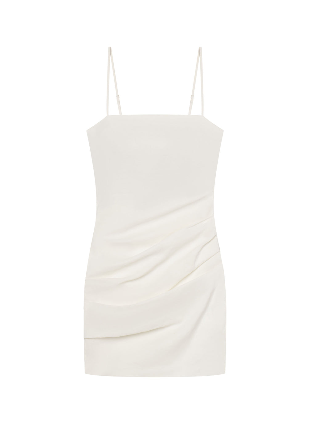 The Mya Dress is crafted from compact stretch linen—an elevated, softly structured fabric that blends linen, viscose, and a hint of stretch—in crisp white. This mini silhouette features delicate spaghetti straps and subtle side gathers for a clean, sculpted look with a touch of ease. Shop Dresses.