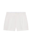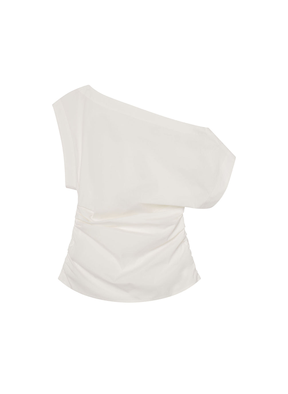 The Nara Top is crafted from white Pima stretch poplin—a soft, breathable fabric made from long-staple cotton fibers with a smooth finish, fine texture, and gentle structure—with a hint of stretch for ease. This off-the-shoulder silhouette features sculptural draping across the neckline, with gathered side seams that cinch at the waist and release into a smooth, hip-length hem. Shop Tops.