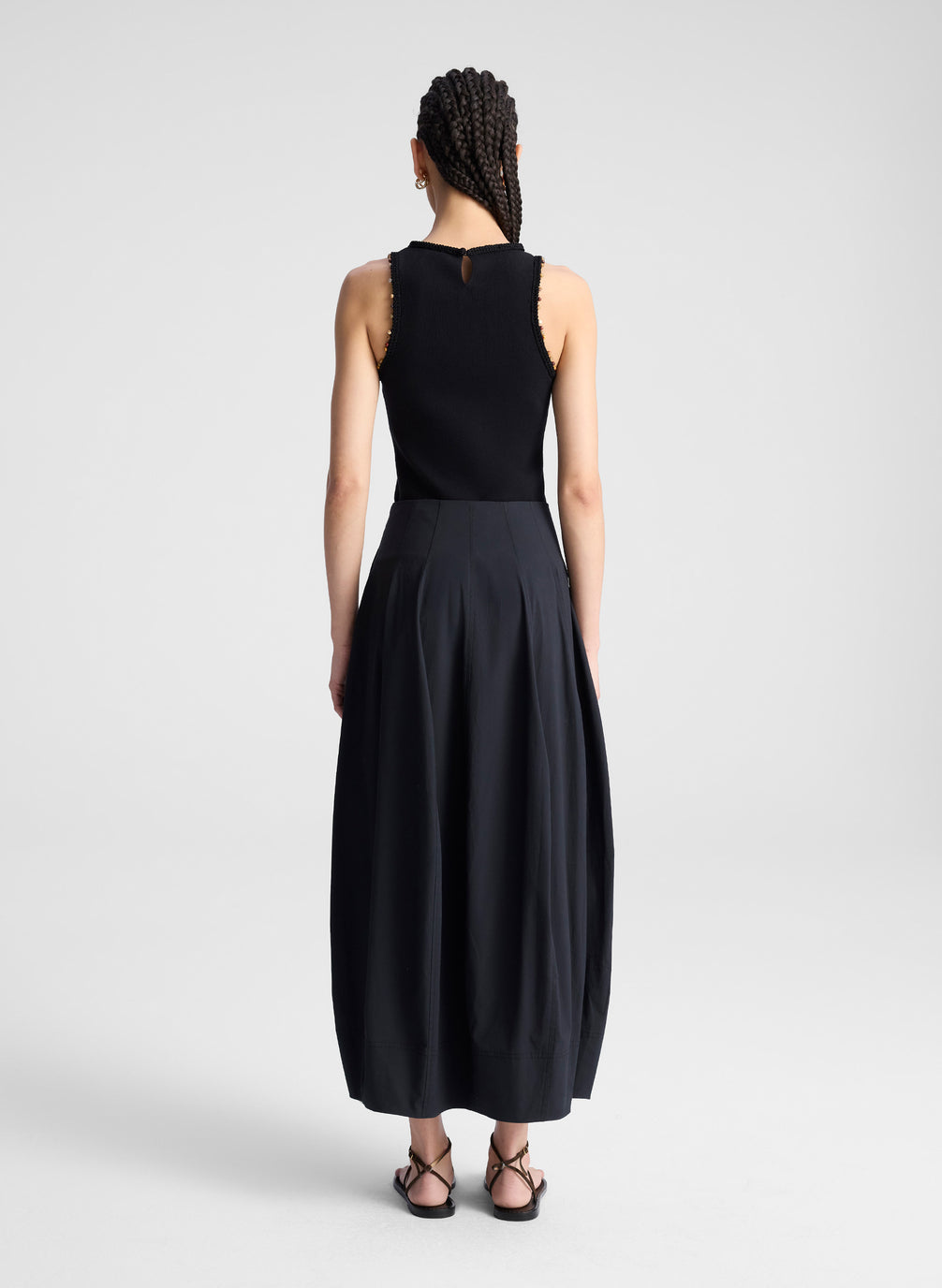 The Nelly Top is crafted from compact stretch cotton in classic black for a smooth, sculpted fit. A high neckline and racerback are finished with tonal crochet and hand-applied beading—an elevated nod to artisanal detail. Shop Tops.