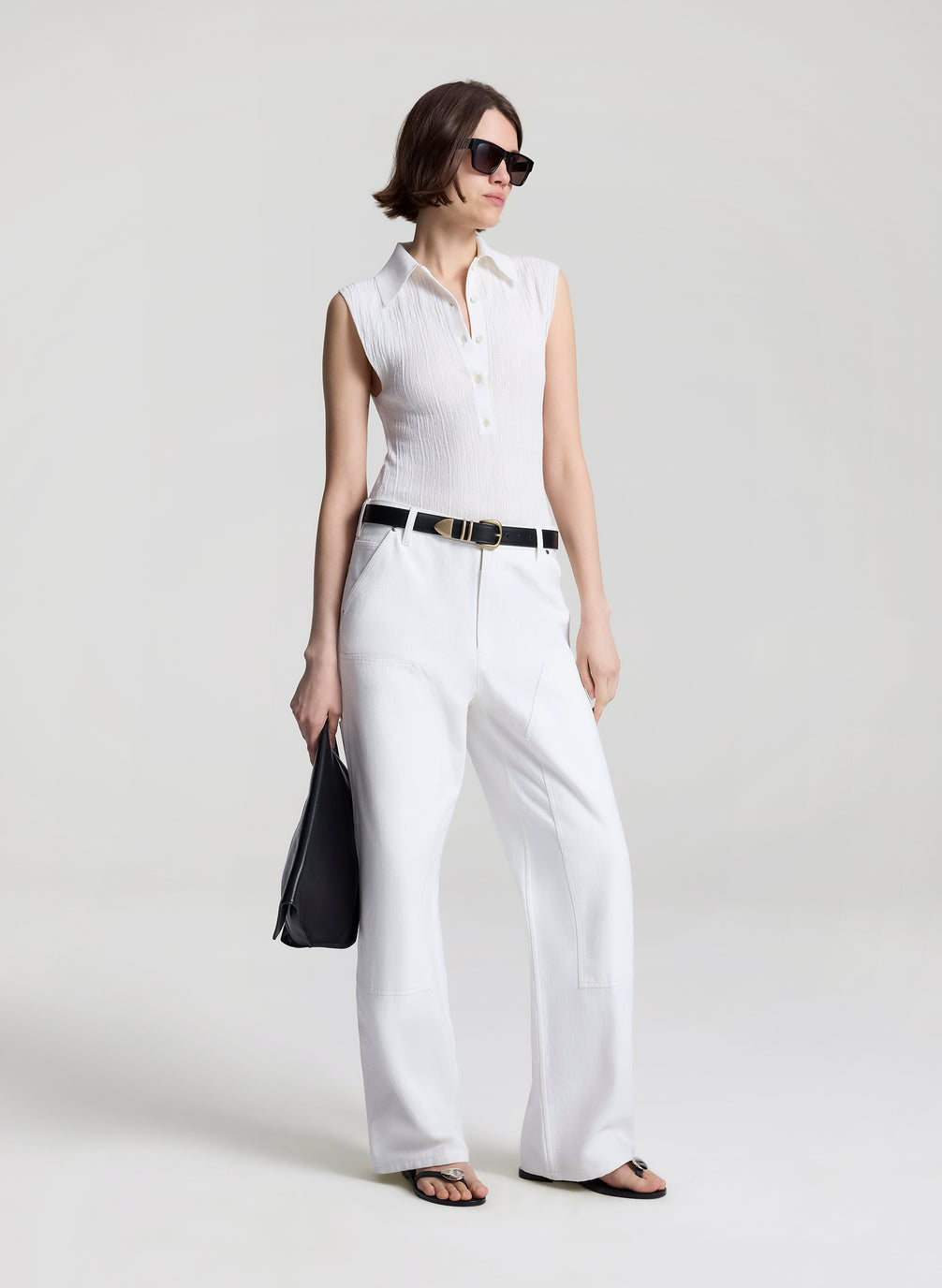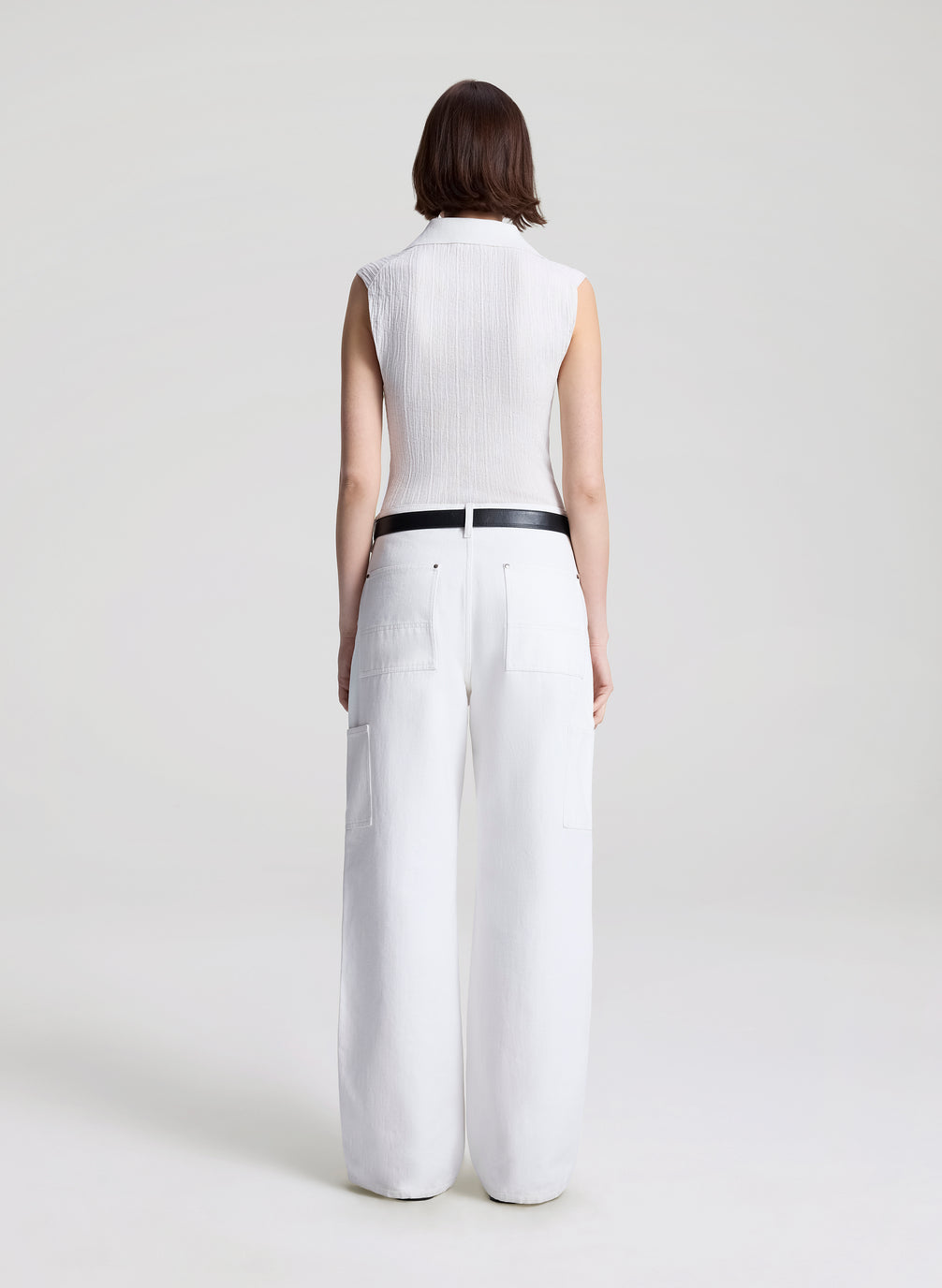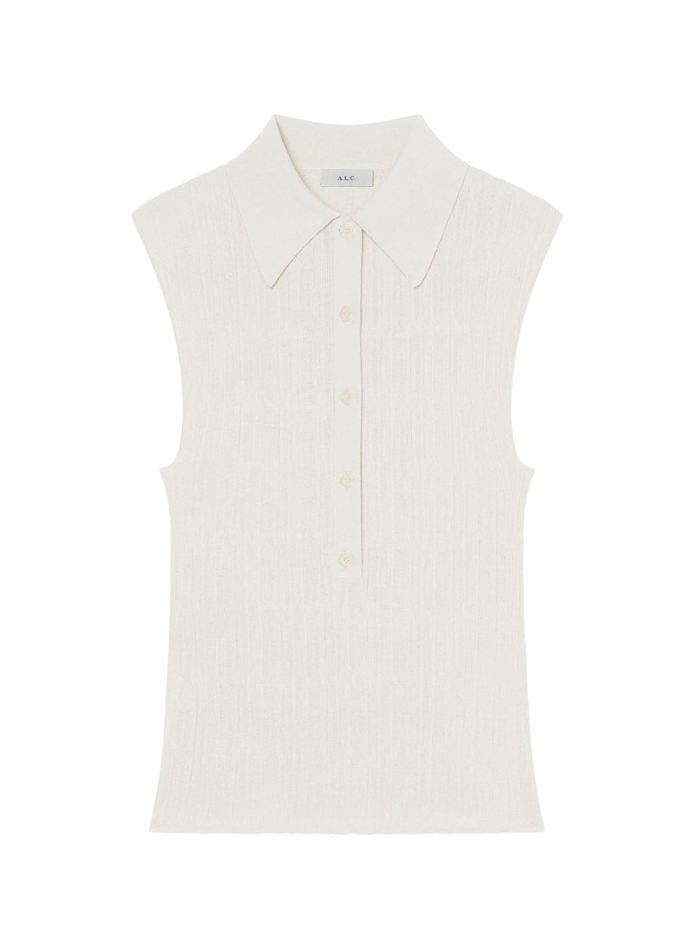 The Ollie Top is knitted from an Italian fine-gauge cotton-blend yarn—exclusive to A.L.C.—in timeless white. This sleek, sleeveless silhouette features a spread collar and button placket. Shop Tops.