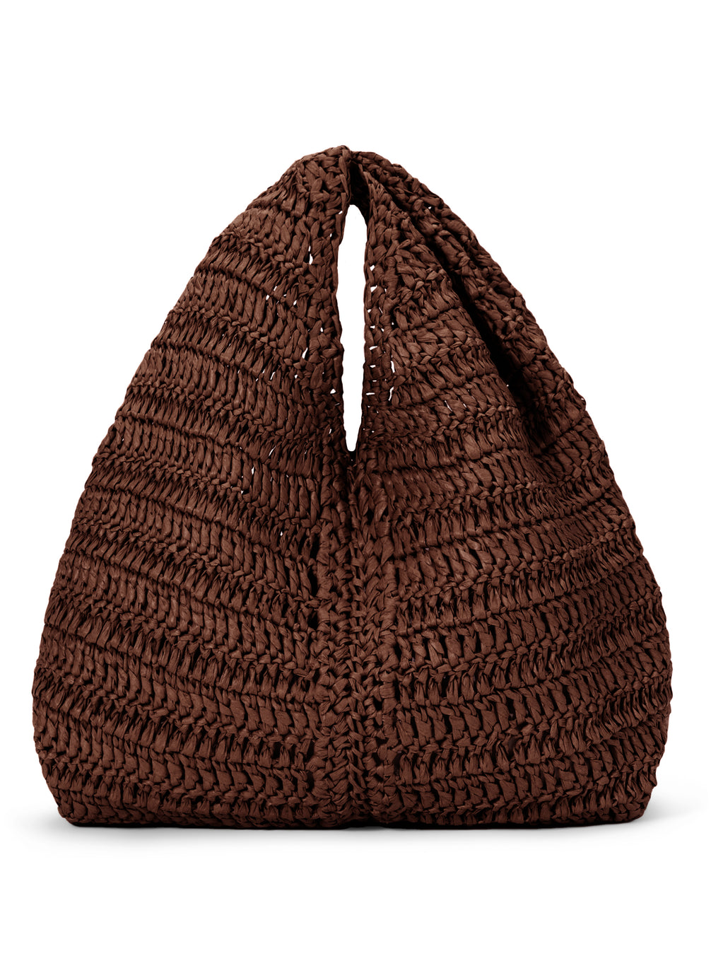 The Simone Bag is woven from 100% raffia in a rich chocolate hue. This mini silhouette features a soft, flexible shape and a twisted handle for a modern, sculptural finish. Shop Accessories.