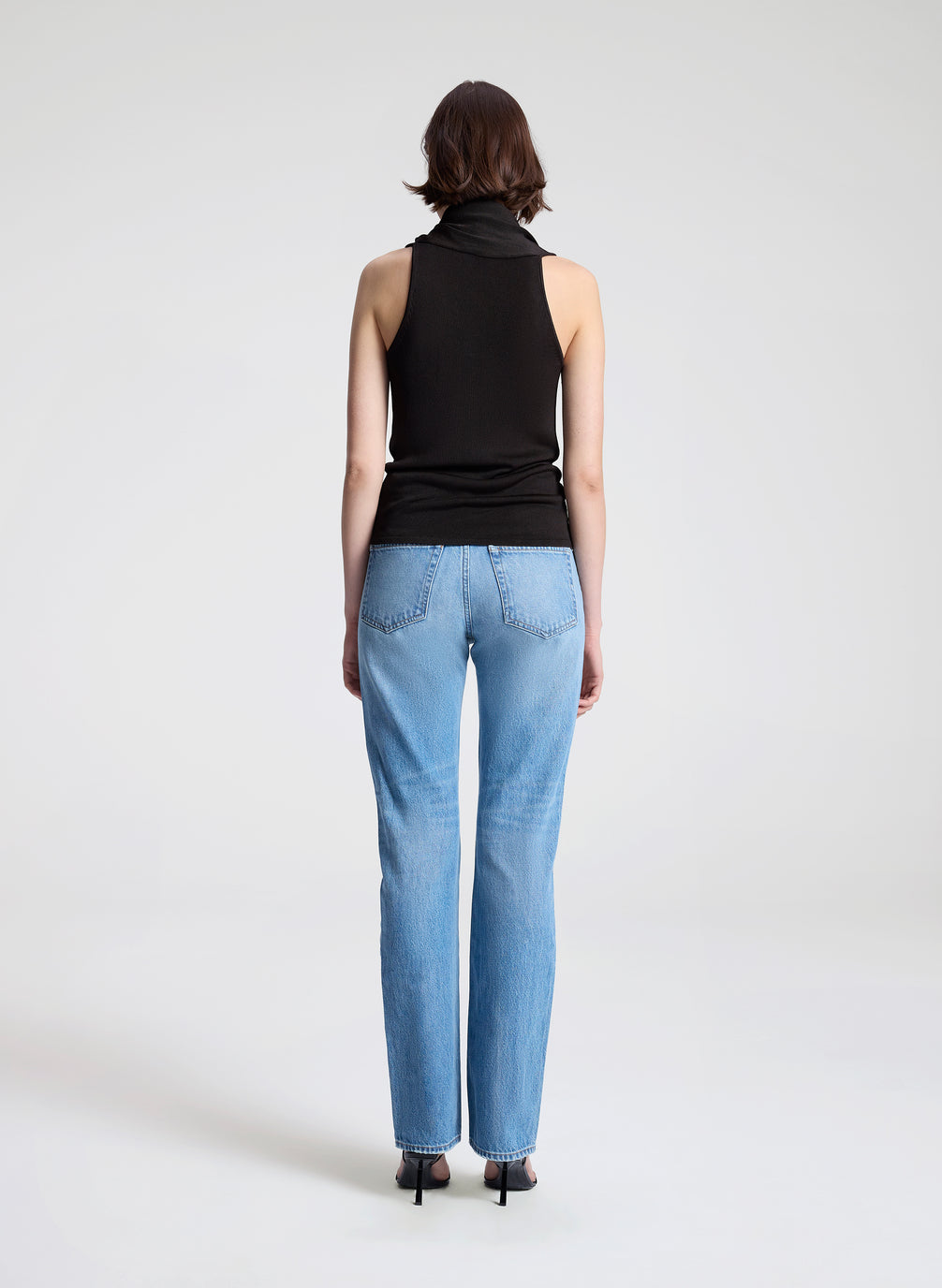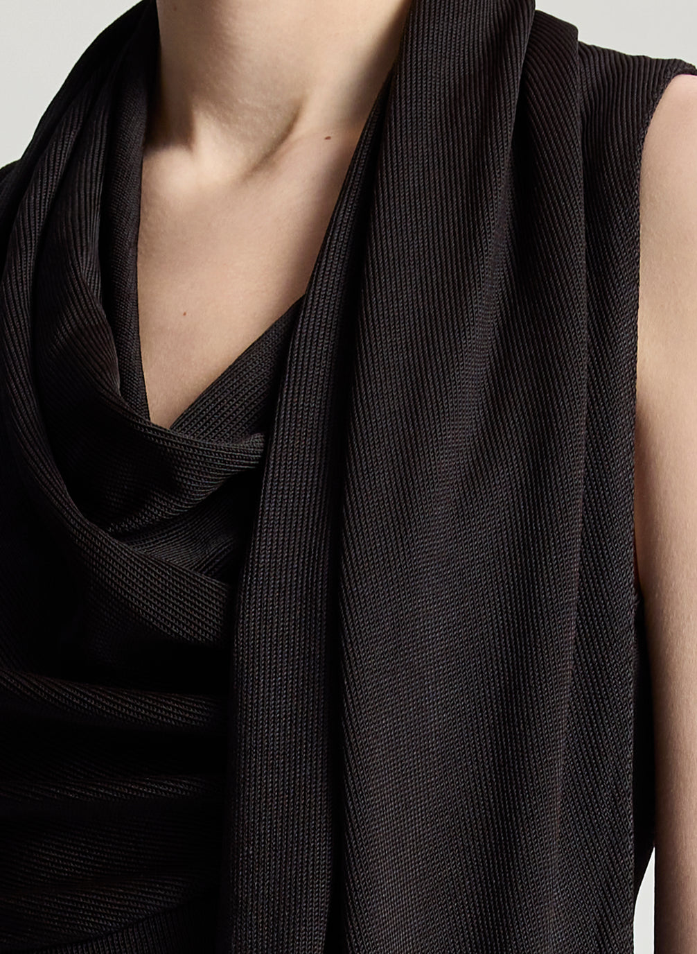 The Sonya Top is crafted from our sleek viscose fabric with a subtle sheen in a rich dark brown. Effortlessly draped, this sleeveless silhouette features a cowl neckline that extends into an elongated scarf detail, lending graceful movement. This style runs true to size. Shop Tops.