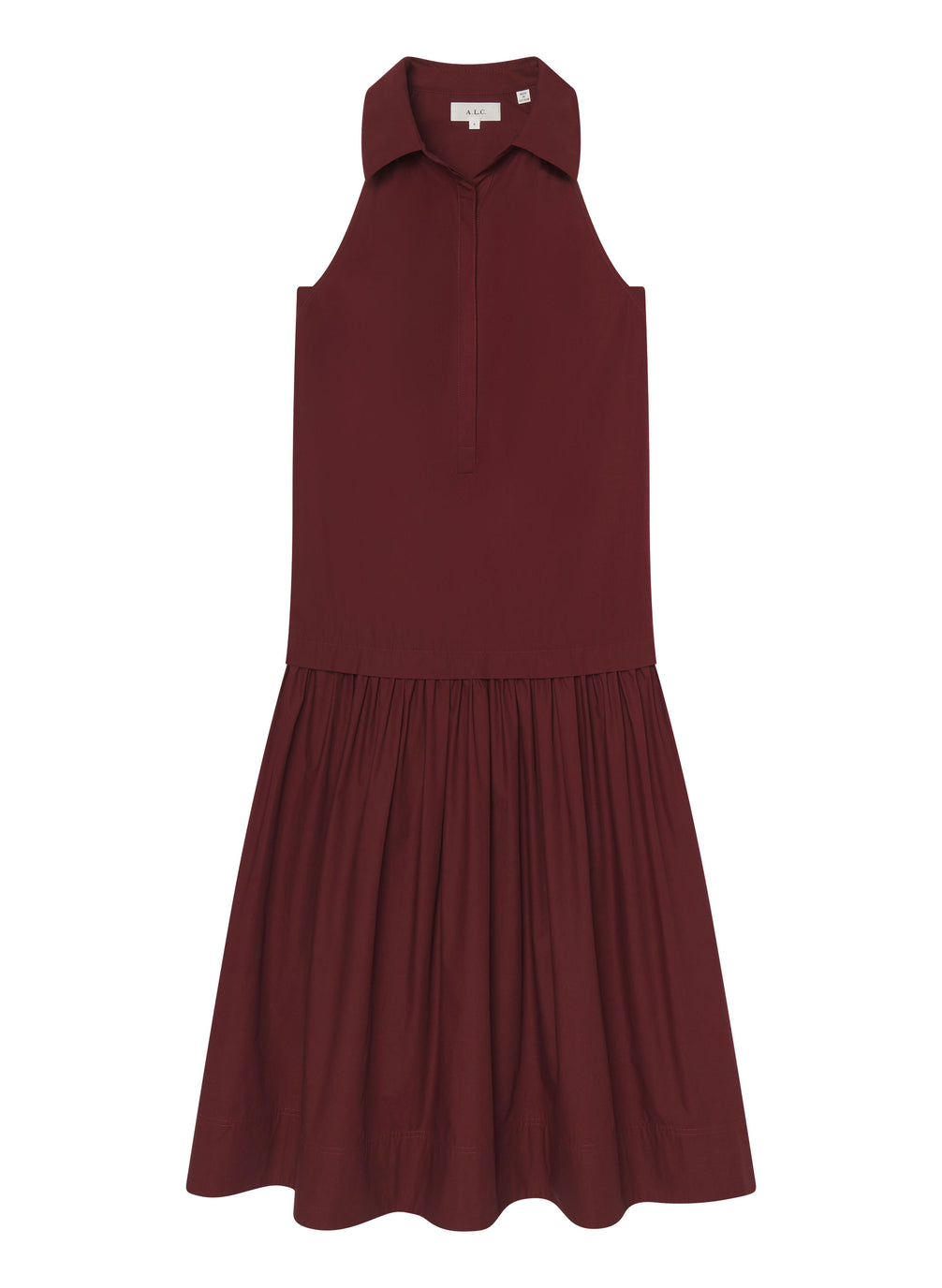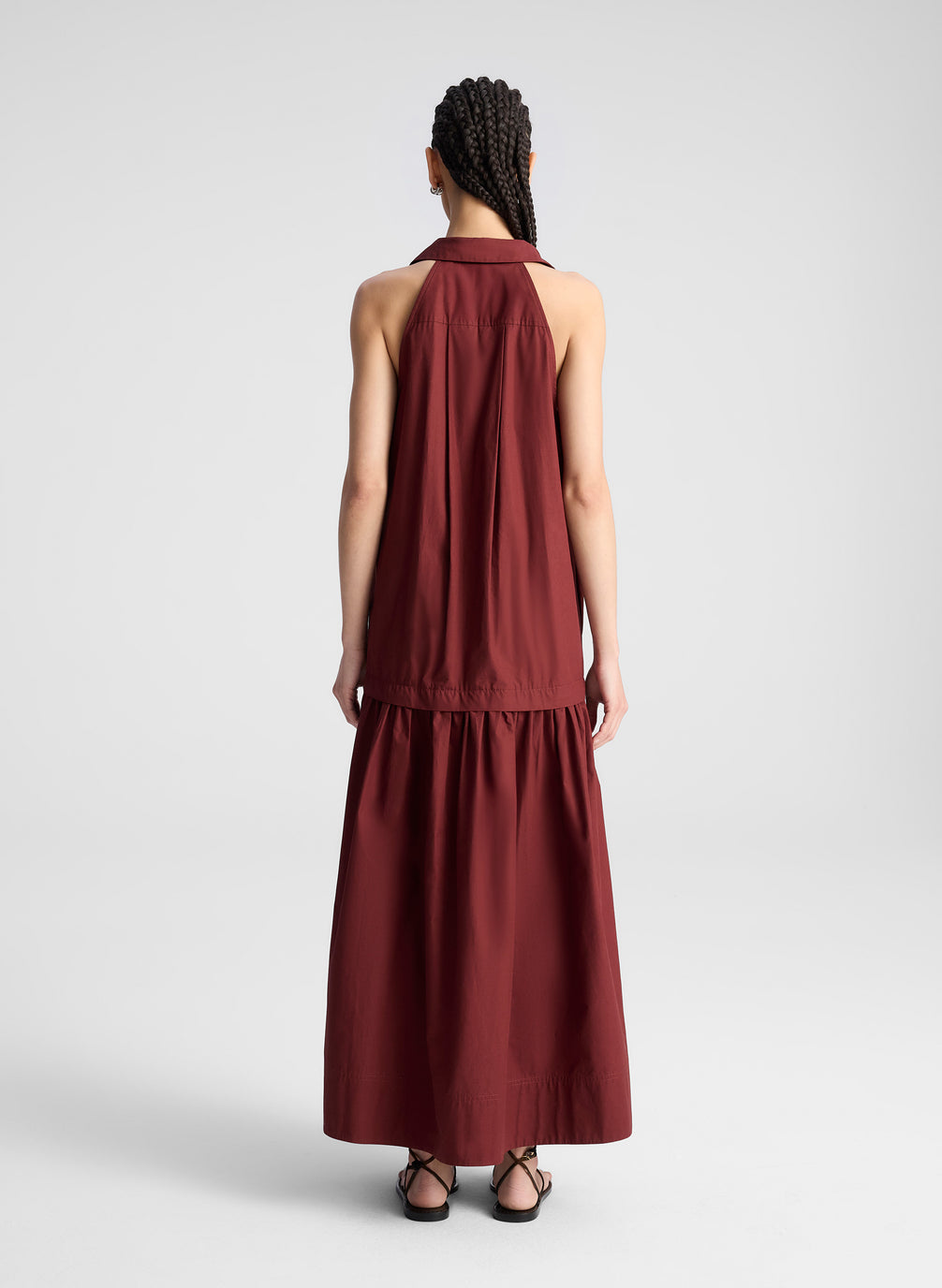 The Vera Dress is crafted from Italian polished cotton poplin—a crisp, breathable fabric with gentle structure and a refined, smooth hand—in a rich burgundy hue. This sleeveless halter silhouette features a sharp collar, button-down half placket, and an easy dropped waist that flows into a gathered skirt for a softly structured shape. This style runs oversized — we recommend sizing down for a closer fit. Shop Dresses.