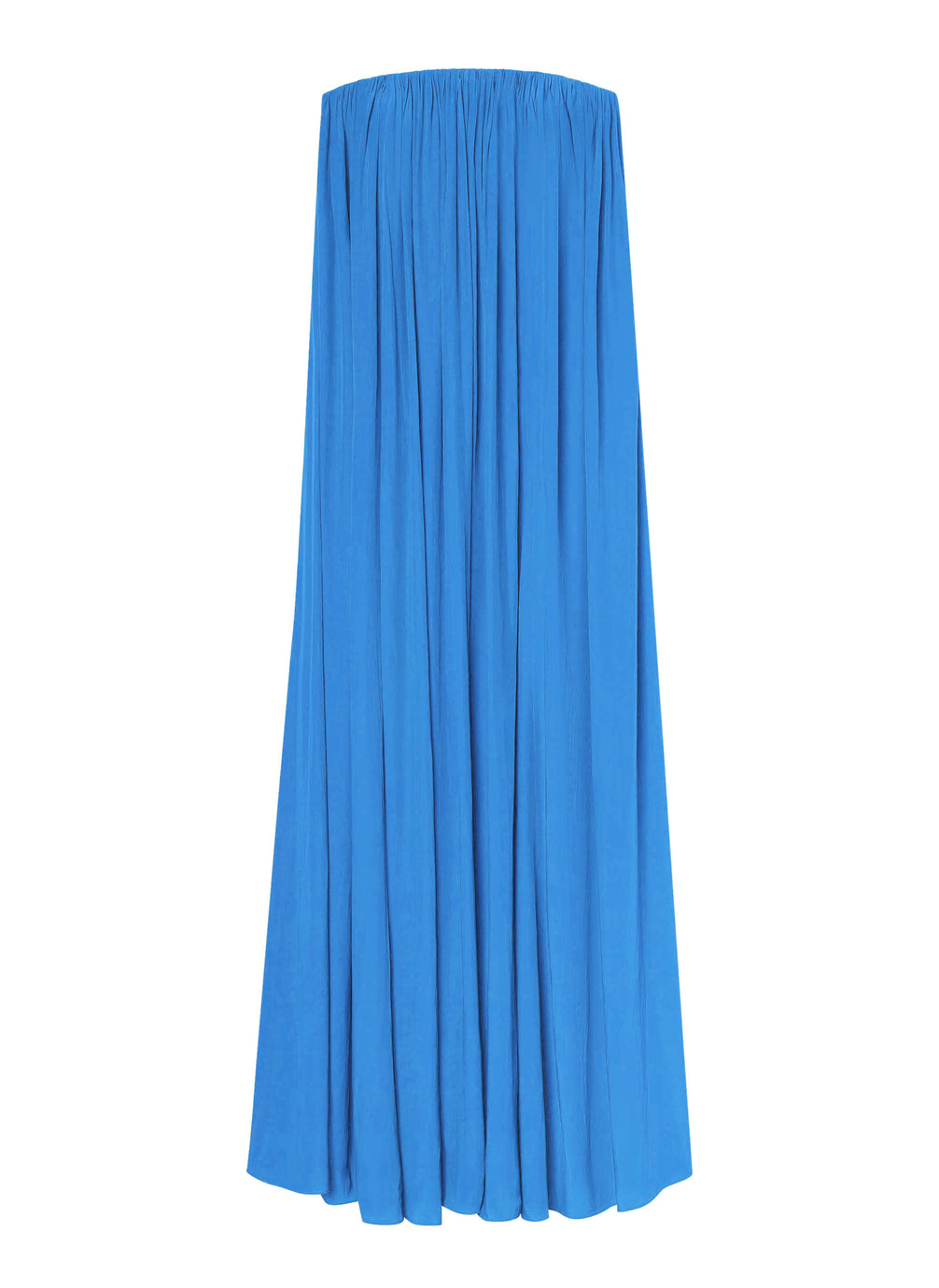 The Wynn Gown is crafted from our fluid parachute fabric in a bright coastal blue. Designed for graceful movement, this full-length silhouette drapes effortlessly from a gathered strapless neckline, with a structured inner corset, creating a voluminous yet weightless effect. Shop Dresses.